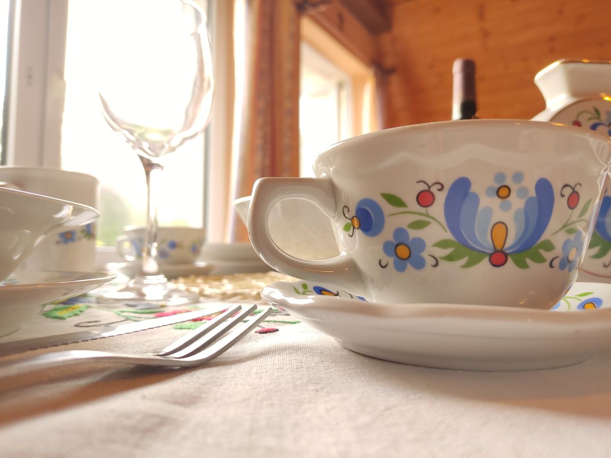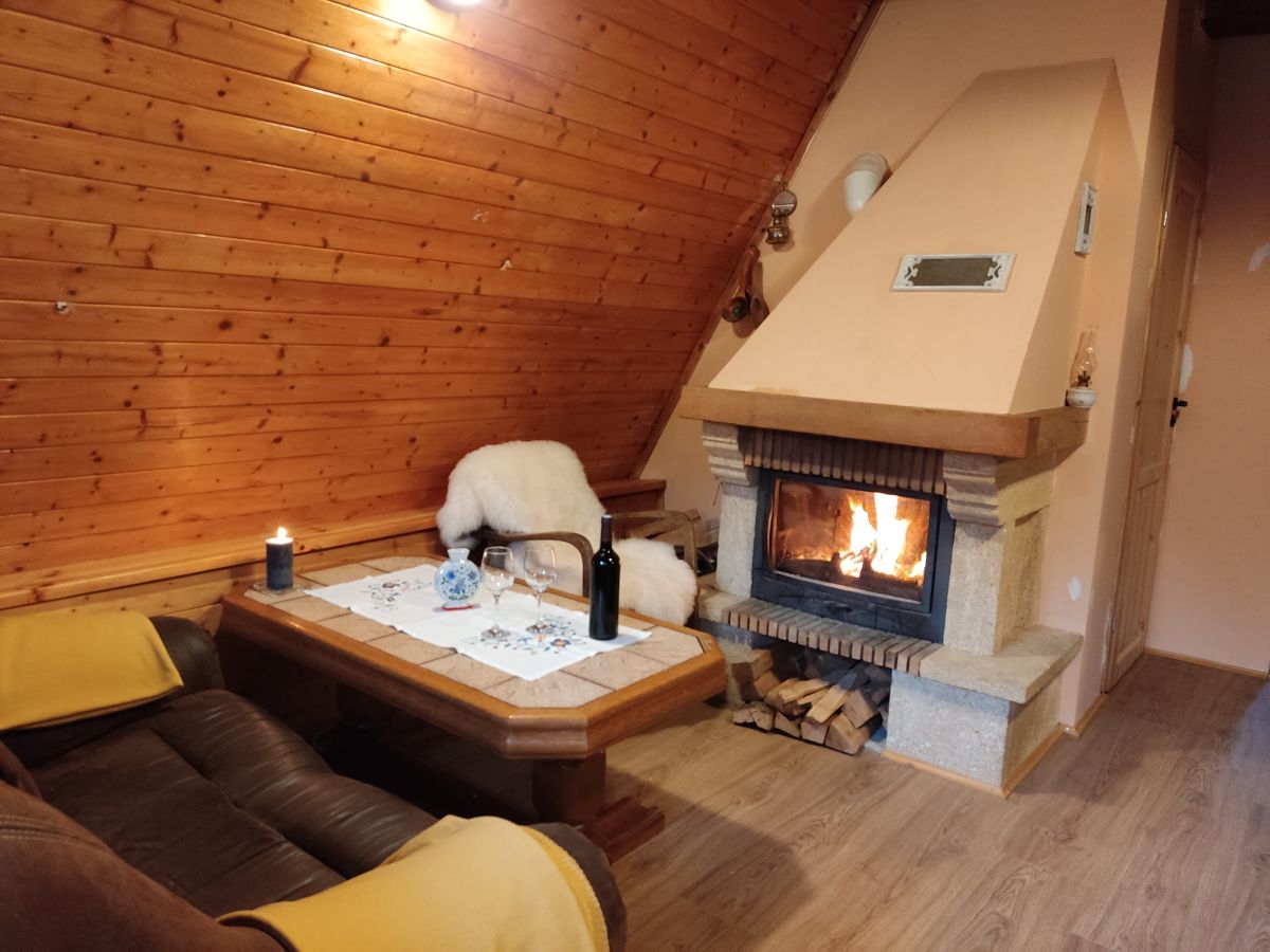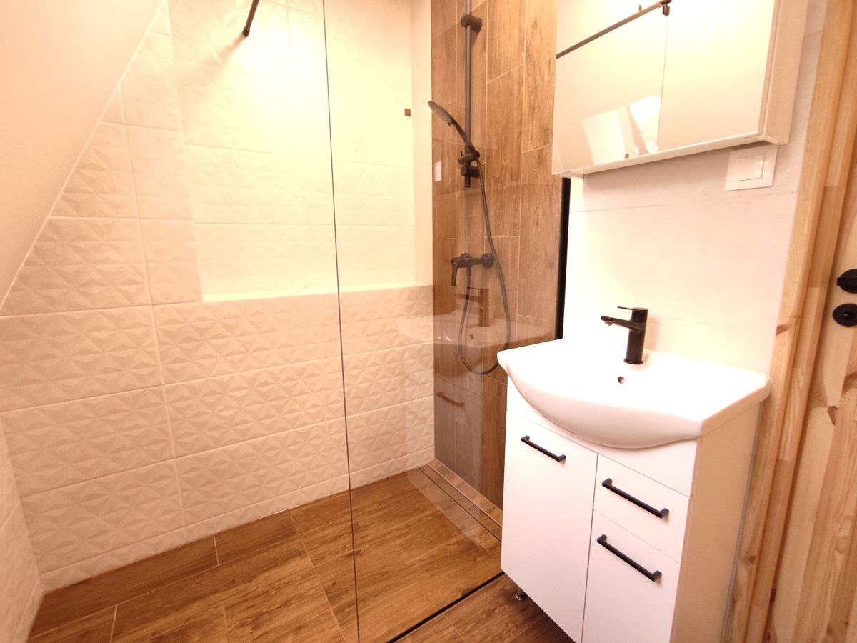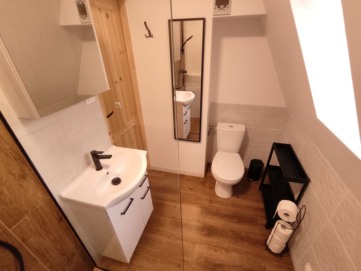 Na parterze budynku znajduje się salon, kuchnia, łazienka oraz 2 osobowa sypialnia. Kuchnia wyposażona
