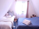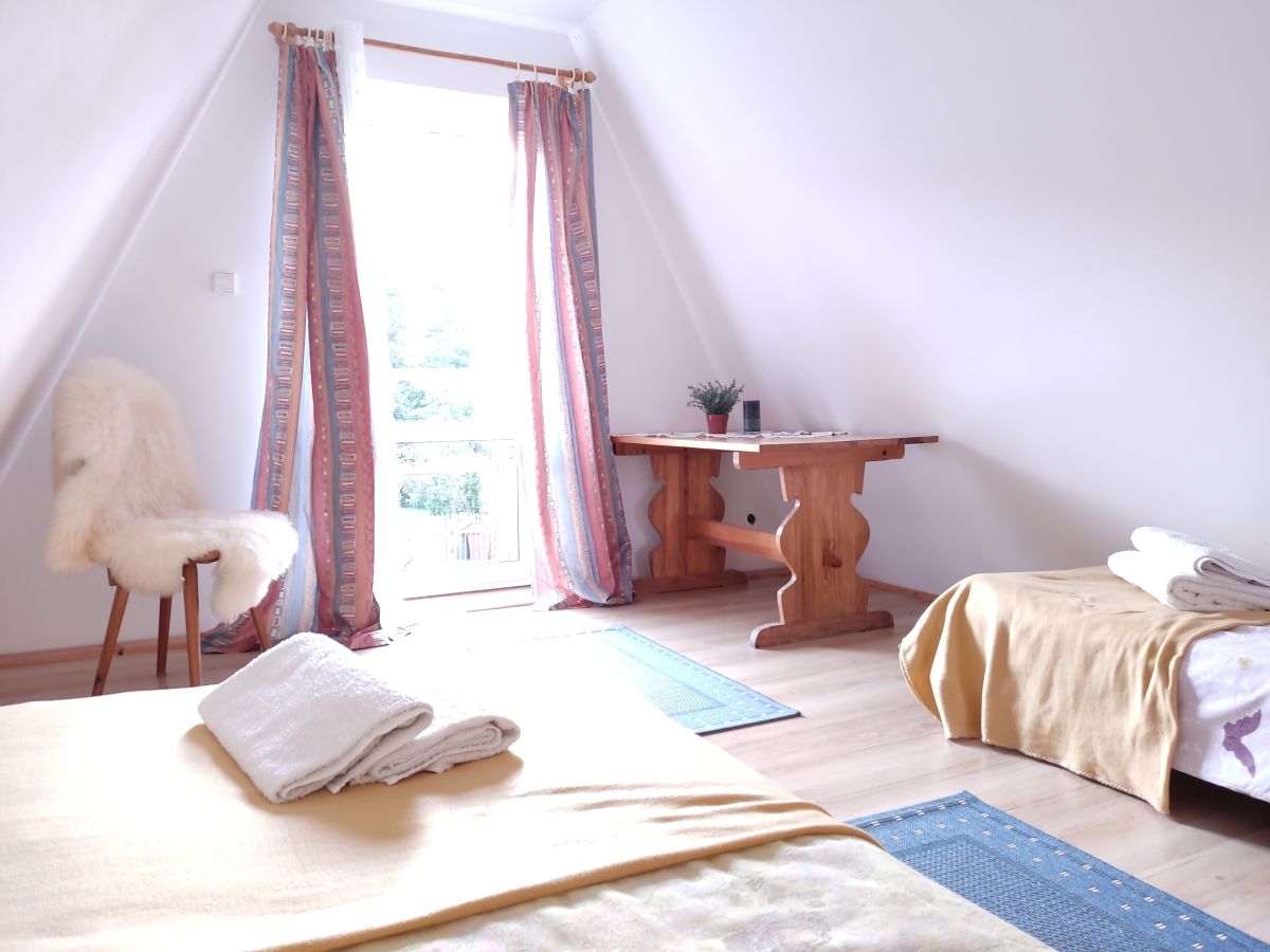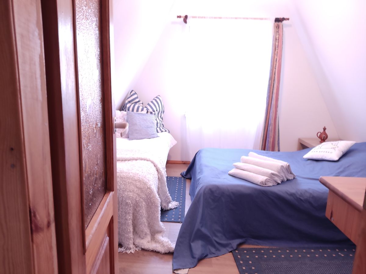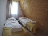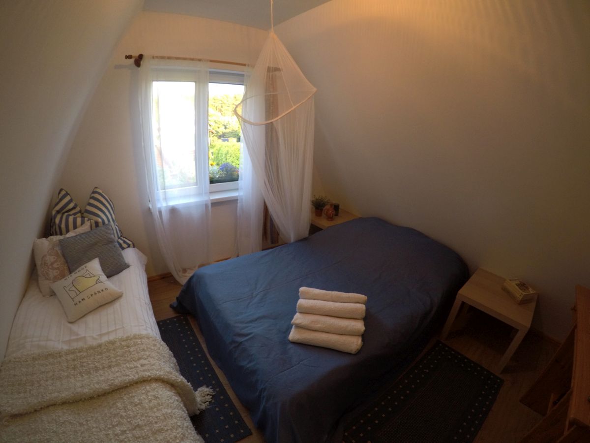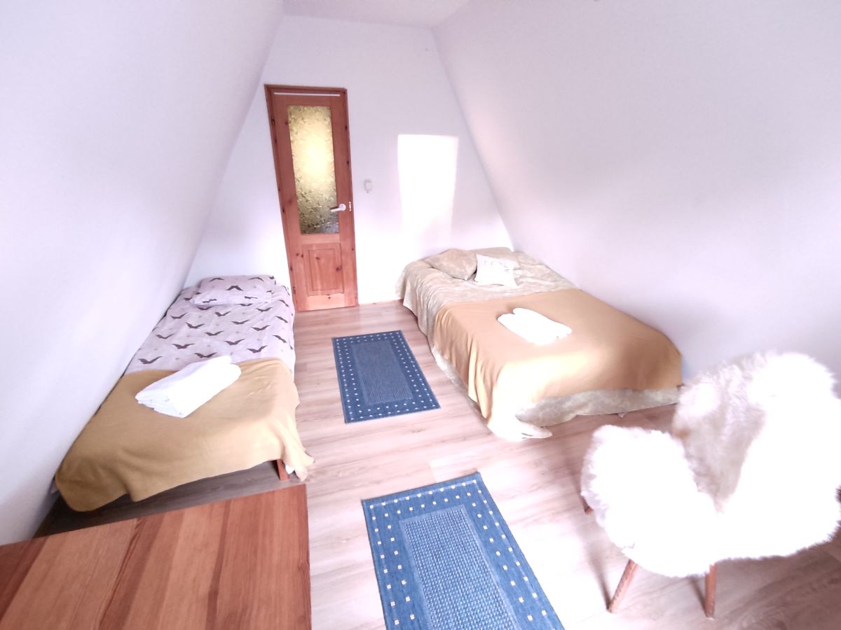 Piętro domku zajmują dwie sypialnie. Obie wyposażone są w duże łóżka 2 osobowe o szerokości 160 cm oraz
