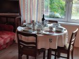 W salonie znajdują się 2 sofy, telewizor, konsola Play Station 3 z zestawem gier, stół z 4 krzesłami oraz
